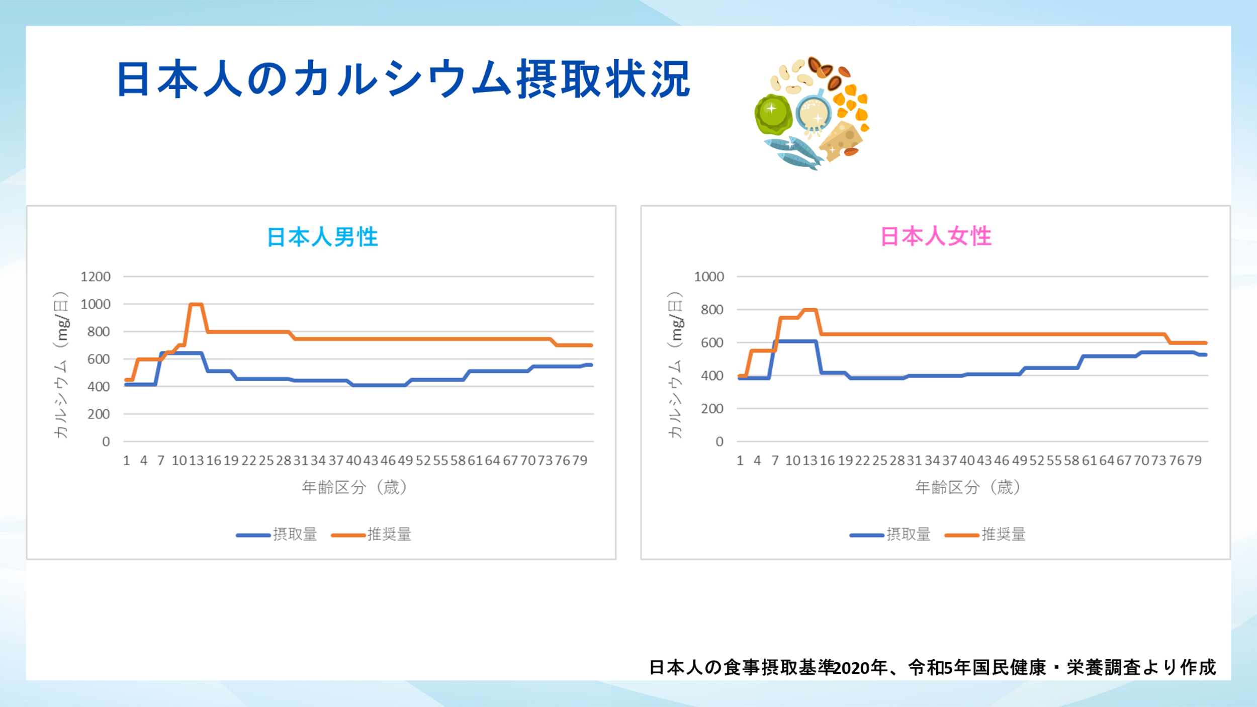 日本人のカルシウム摂取量と推奨量はかなり乖離しています(図参照)。乖離が大きいところでは200㎎以上も不足しています。