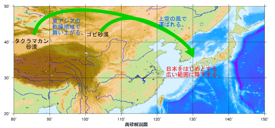黄砂とは、中国やモンゴルの砂漠・黄土地帯などの乾いた土壌が、強い風(偏西風)により上空まで吹き上げられ、そのまま長い距離を飛んで、大気中に浮遊または降下する現象のことを言います。